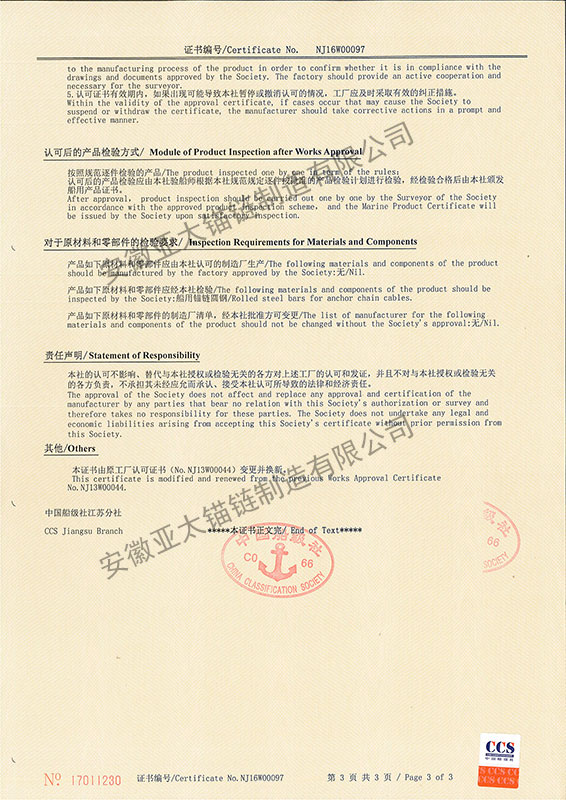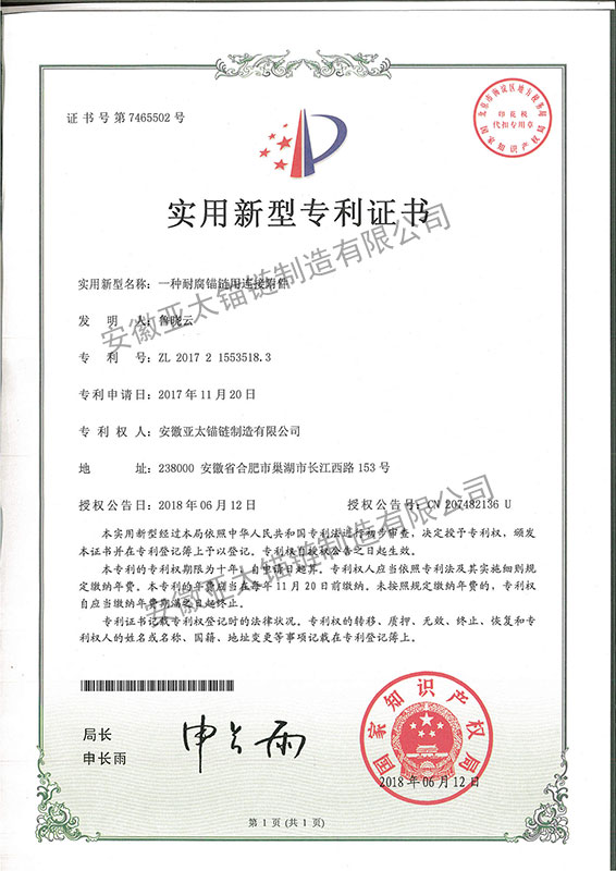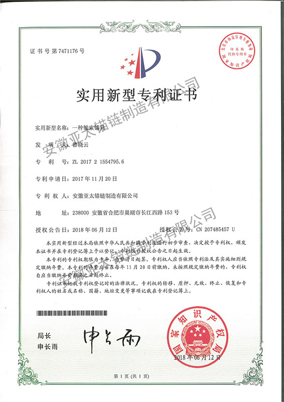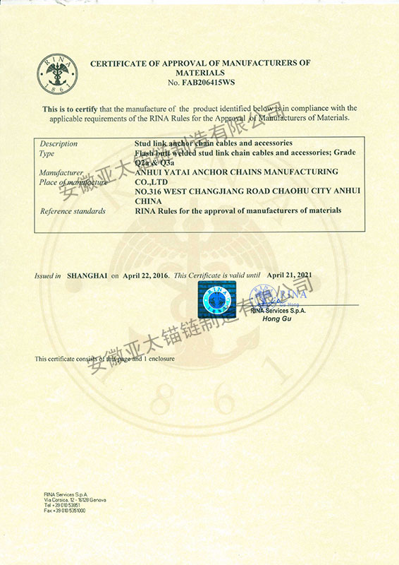 安徽亞太錨鏈制造有限公司是國家高新技術企業(yè),也是國家GB/T 549-2017《電焊錨鏈》標準的起草和制定單位之一。公司旗下設有錨鏈分廠、浮標分廠、舾裝件分廠等多個分廠。公司專業(yè)從事φ12.5mm-φ107mm二、三級船用錨鏈、浮標錨鏈、錨鏈附件,錨、船舶曬裝產(chǎn)品、航標、系船浮、船型標、多種規(guī)格海洋監(jiān)測浮標及航標燈等產(chǎn)品的生產(chǎn)、安裝和服務。目前公司的產(chǎn)品銷往全國各地船廠、碼頭、航標處、航道局、海洋局,并已走上國際市場,如東南亞、中東、歐美等國家。